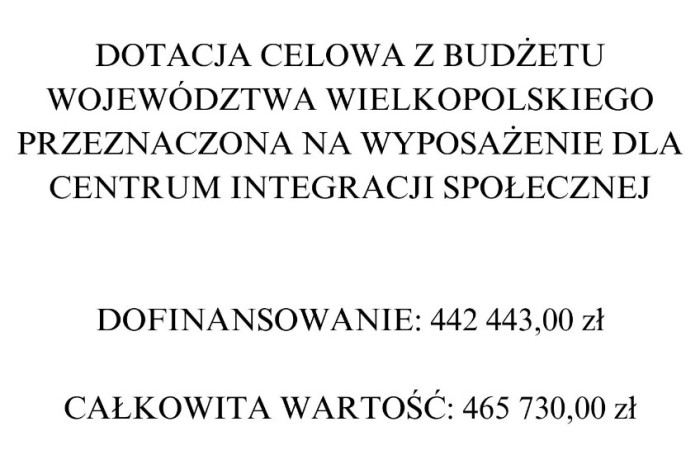 Gmina Swarzędz otrzymała dotację celową z budżetu Województwa Wielkopolskiego przeznaczoną na wyposażenie dla centrum integracji społecznej w ramach dofinansowania ze środków Samorządu Województwa Wielkopolskiego.